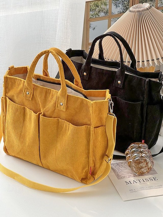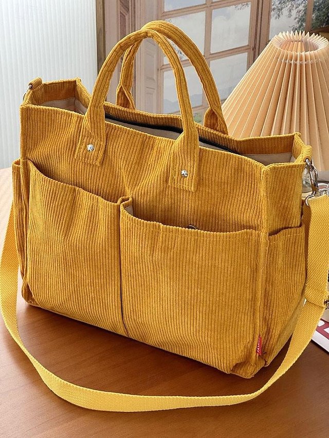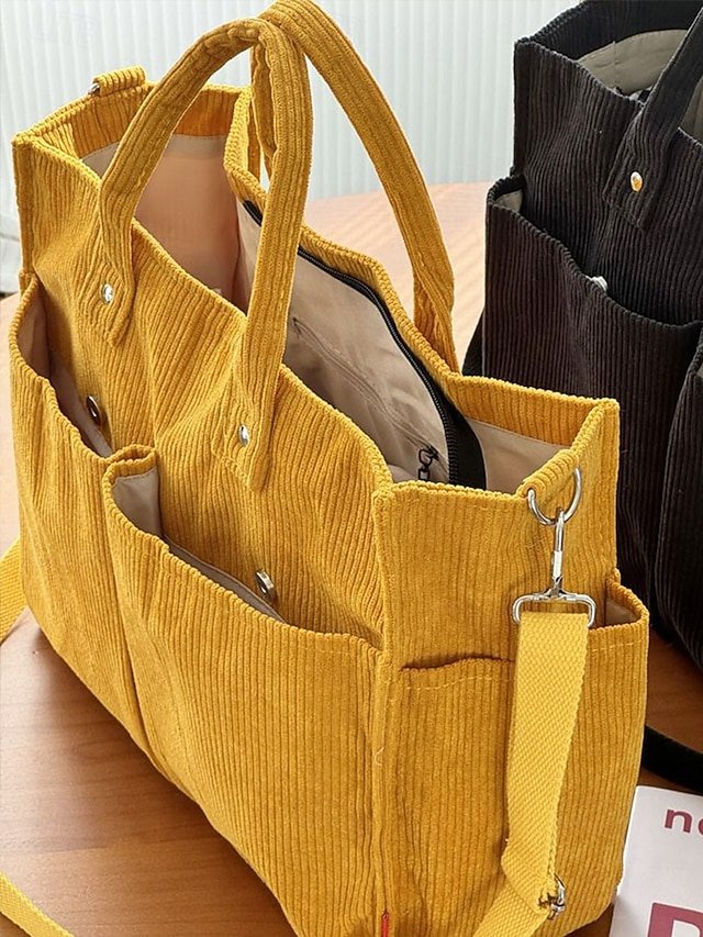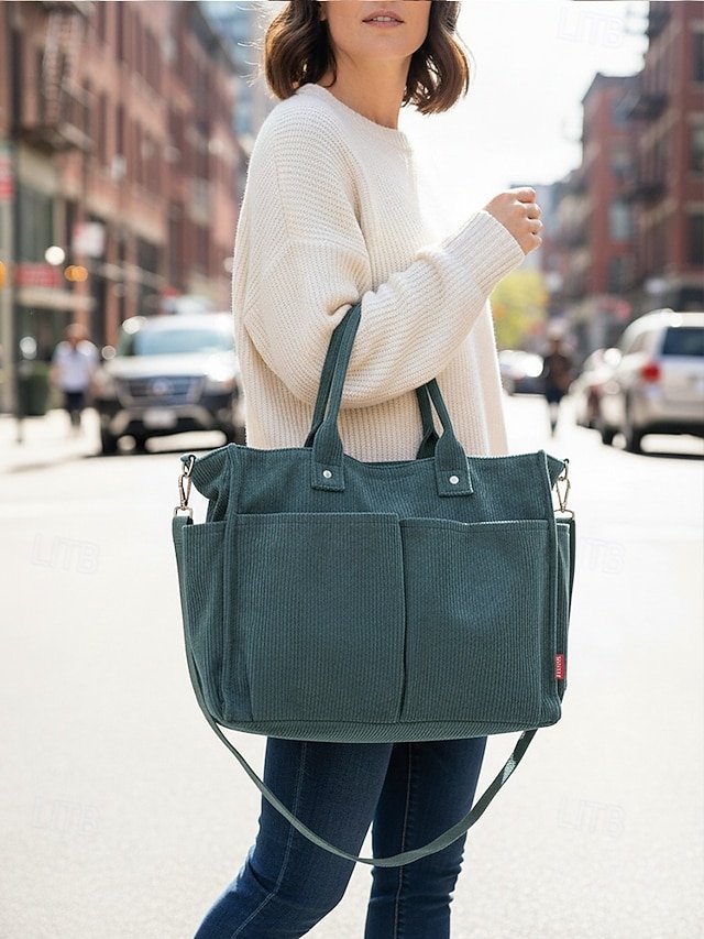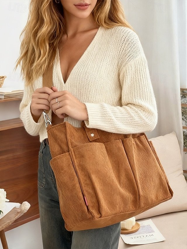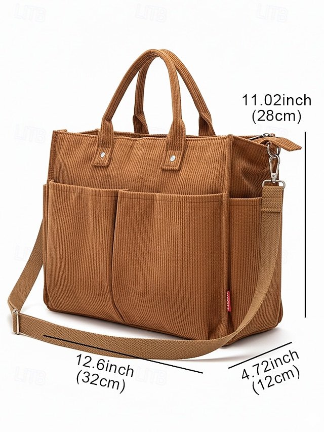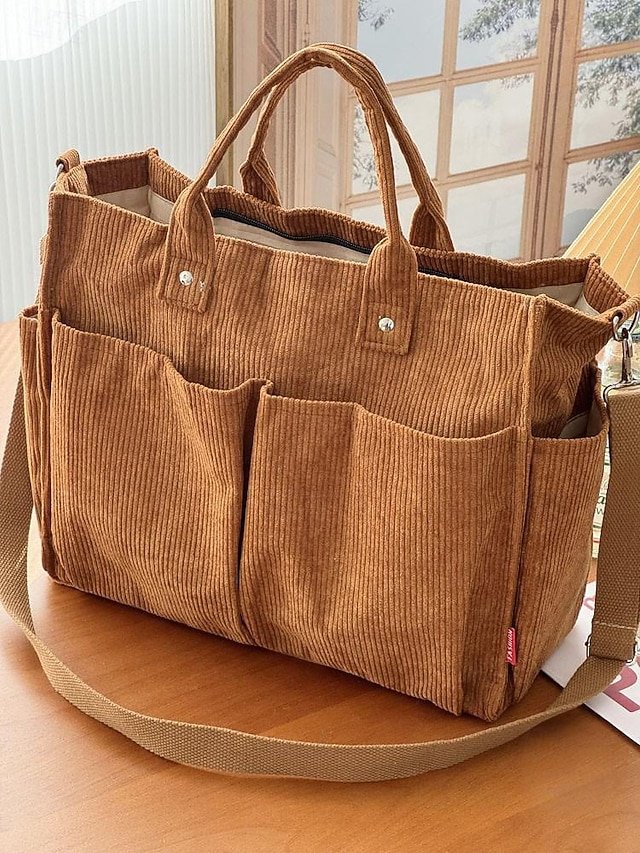 Women’s Corduroy Tote Bag with Multiple Pockets, Casual