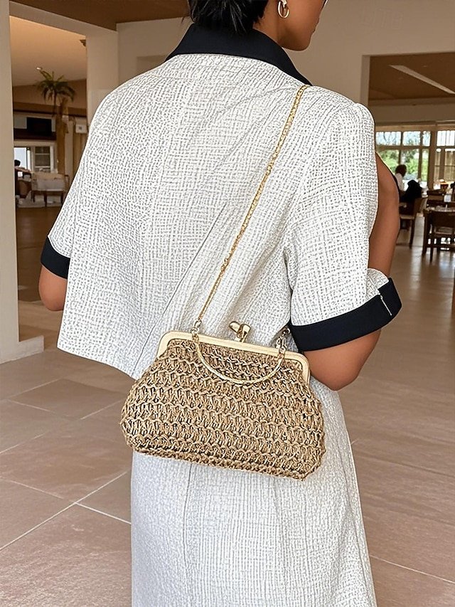 Women’s Vintage Woven Straw Handbag – Elegant Kiss Lock
